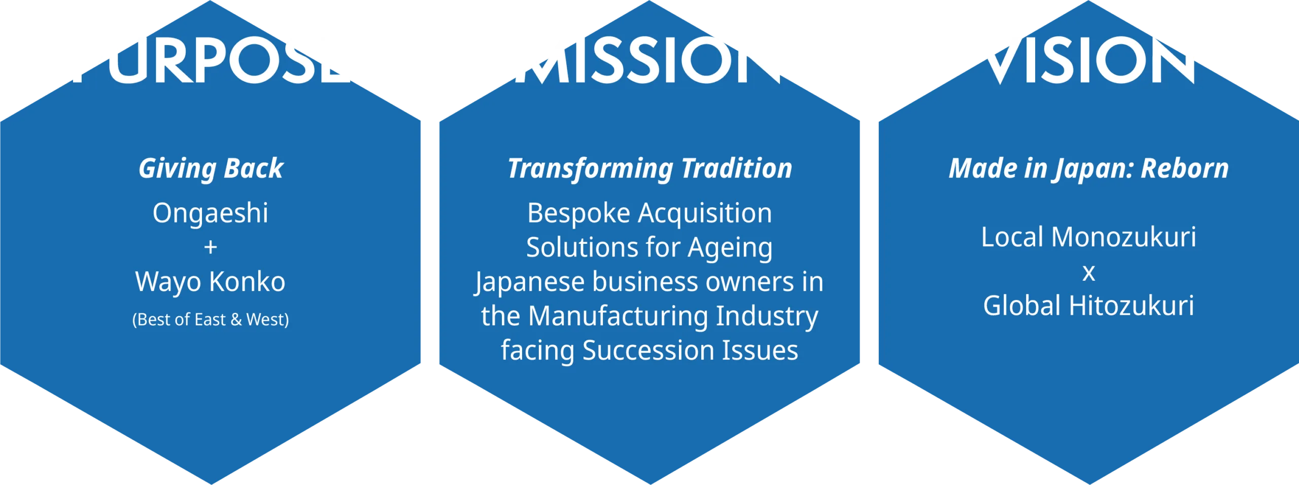 We are driven by our belief in “the Best of East & West” (和洋混淆・Wayo Konko), respecting the Japanese business mindset of “Win-Win Relations” (三方良し・Sanpo Yoshi) and “Reciprocal Altruism” (自利利他・Jiri Rita).